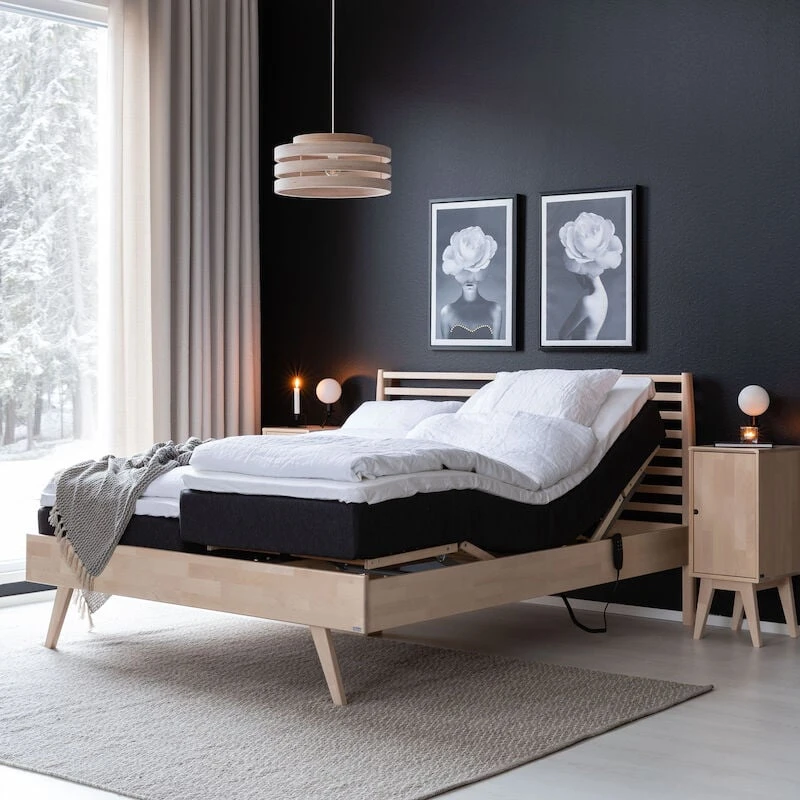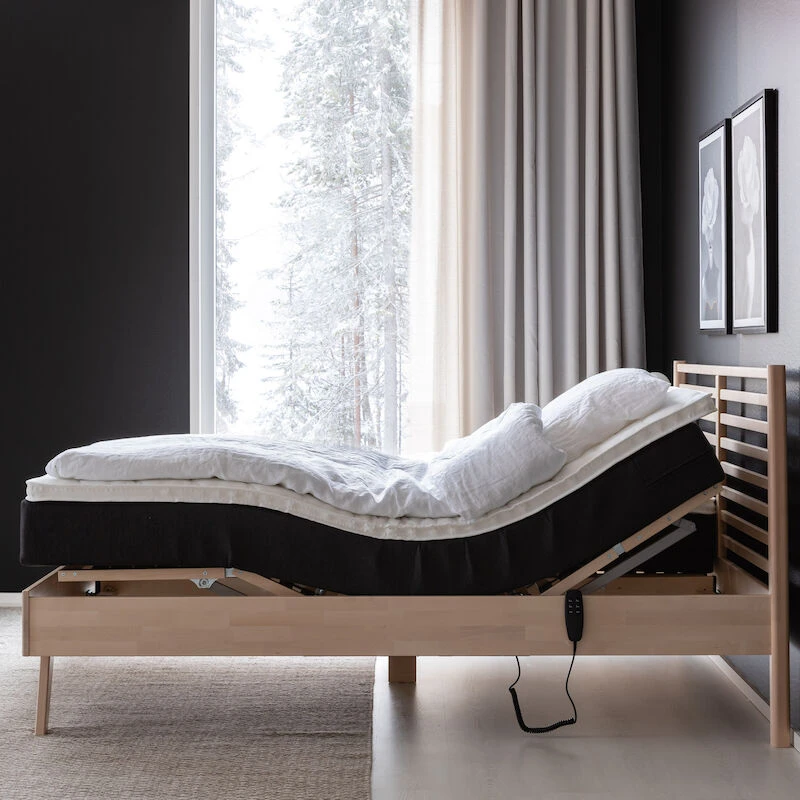 Todella tyylikäs ja laadukas Kiteen Notte moottorisänkypaketti. Sängyn runko, patjat ja petauspatjat on valmistettu Suomessa. Säädettävät moottoripohjat on valmistettu Saksassa. Langallisen kaukosäätimen avulla voi säätää jalka tai pääpäädyn korkeuden haluttuun asentoon. Moottoripohjissa on yksi moottorikotelo, jonka sisällä on kaksi laadukasta ja hiljaista moottoria; jalka- ja päädylle omat. Joustinpatjat ovat hyvät ja tukevat, ergonomisella ja yksilöllisesti myötäilevällä pussijousituksella. Joustinpatjan makuupinta on valkoista joustokangasta, jolloin jousisto pystyy paremmin mukautumaan nukkujan vartalon mukaan. Patjoissa on L-jäykkyys, joka on jämäkkä ja nukkujan suositeltu paino on 60-110 kg. Petauspatjat viimeistelevät nukkumismukavuuden. Petauspatjojen sisuksena on profiloitu vaahtomuovi ja päälliset ovat joustokangasta. Petauspatjojen päälliset ovat irroitettavissa vetoketjun avulla ja pestävissä 40°C. Moottoripohjat vaativat toimiakseen verkkovirran, pistotulppa liitetään pistorasiaan.