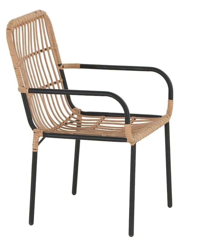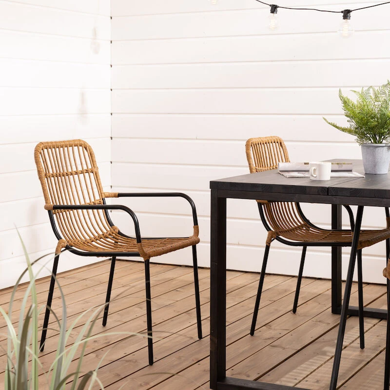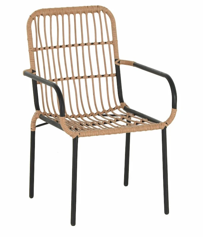 Moderni polyrottinkinen Oldie tuoli vaalealla luonnonvärisellä punokssa. Runko on valmistettu mustaksi maalatusta teräksestä. Tuoleissa on huoltovapaa polyrottinki punos, joka on materiaalina huoleton. Tuoli sopii erinomaisesti katetulle-/lasitetulle terassille tai parvekkeelle, mutta sitä ei tule jättää suoralle sateelle alttiiksi.