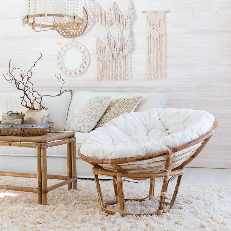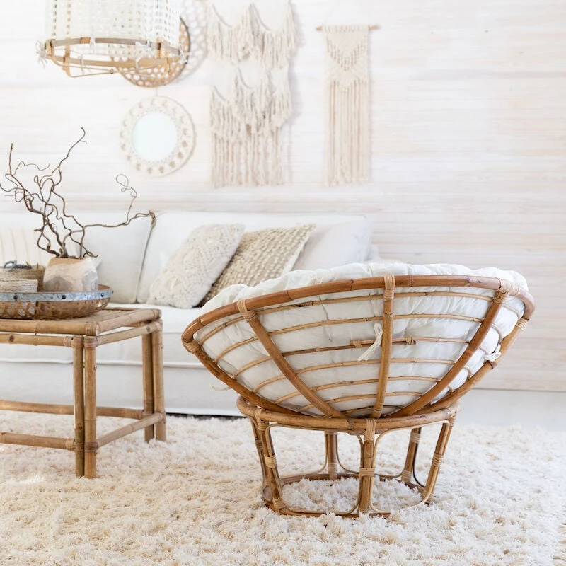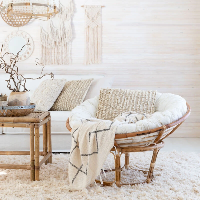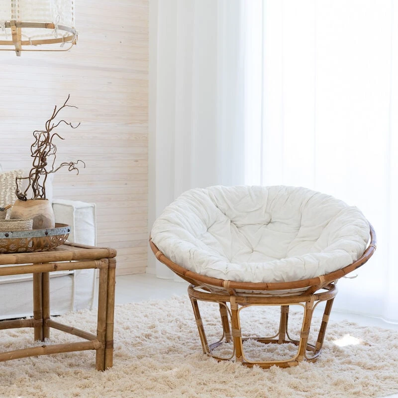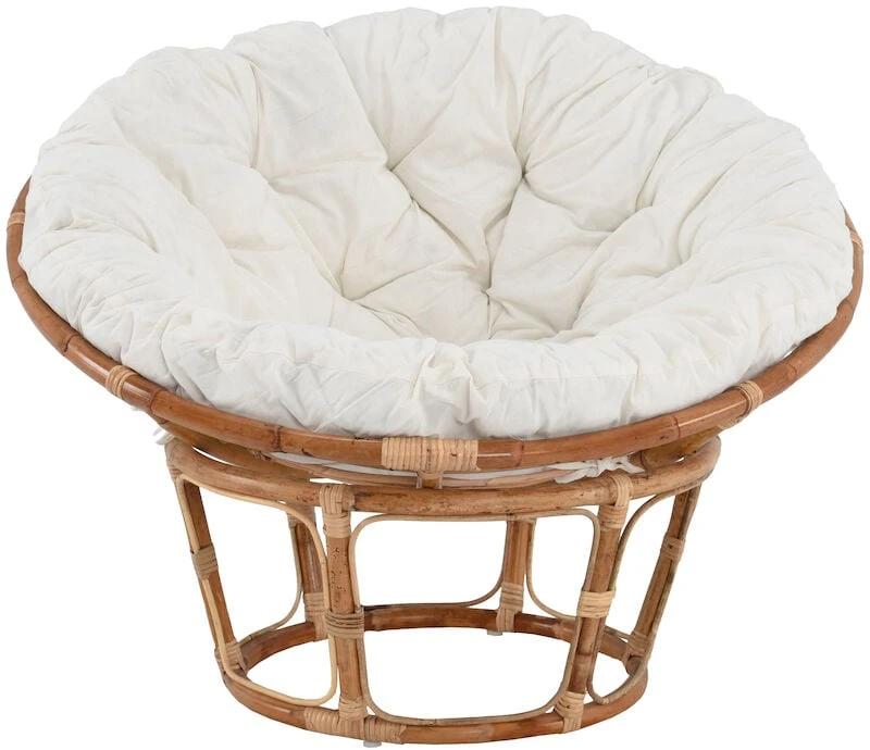 Pesämäinen korituoli on valmistettu aidosta luonnonvärisestä rottingista. Rottinki on ekologinen luonnonmateriaali ja sen ominaisuuksiin kuuluu värivaihtelut ja tummemmat kohdat. Värivaihtelut, epätasaisuudet ja käsityön jälki tekevät jokaisesta rottinkituotteesta yksilöllisen. Rottinki patinoituu ajan saatossa. Korituoli on ajaton ja sopii loistavasti sisäkäyttöön, sekä katettuun ulkotilaan. Istuinosassa on muhkea luonnonvalkoinen pehmuste. Voit yhdistellä siihen lisäksi pehmeän tyynyn tai torkkupeiton ja luoda itsellesi mukavan rentoutumispaikan. Kevyen painon vuoksi sitä on myös helppo liikutella. Jalkaosan halkaisija on 64 cm.