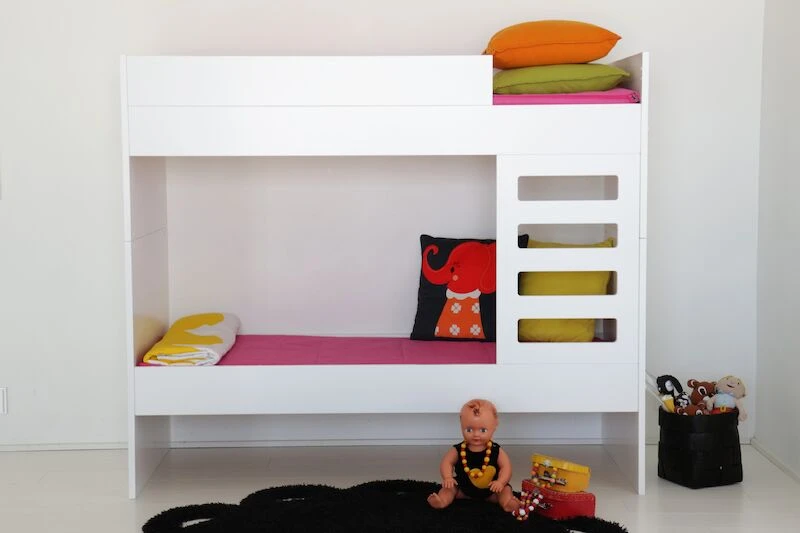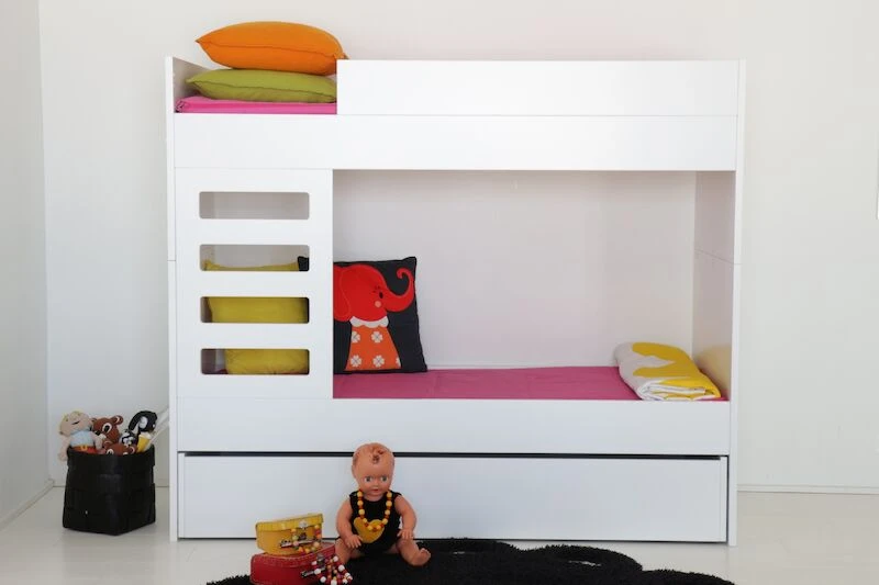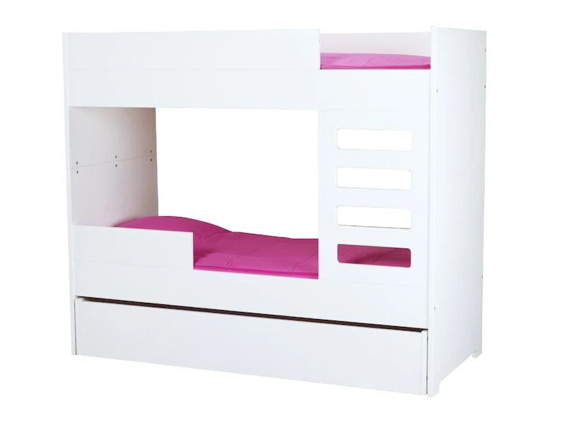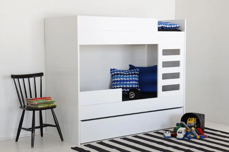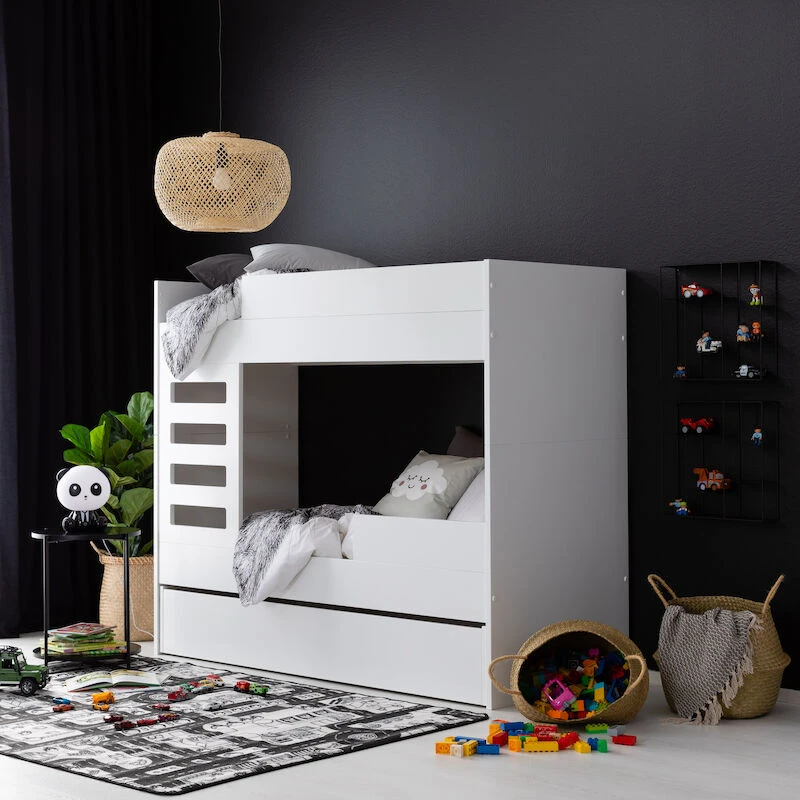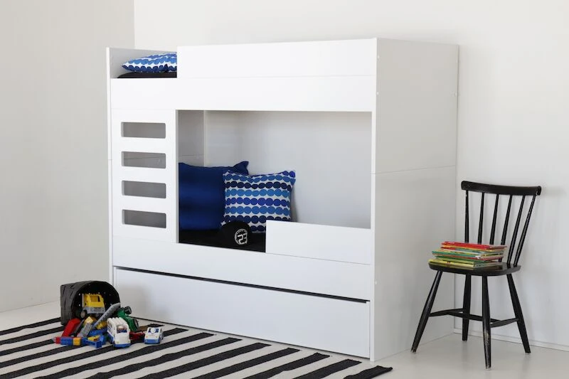 Yksinkertaisen tyylikäs ulkonäkö yhdistettynä laadukkaaseen viimeistelyyn kuvaavat erinomaisesti tätä Viviano-kerrossänkyä. Sänky on valmistettu laadukkaasta ja kestävästä mdf-levystä, joka on maalattu huolelliseti ja ammattitaidolla ajattoman valkoiseksi. Tikapuut voidaan sijoittaa molempiin päihin. Tikkaiden kokonais leveys 46,5 cm, askelman leveys 32 cm ja askelman syvyys n. 2 cm. Ala- ja yläsängyn välitilan korkeus 72 cm sekä yläsängyn turvalaidan korkeus 16 cm. Patjakoko tässä lastenhuoneen edullisessa peruskalusteessa on 70 x 165 cm. Kerrossänky on mahdollista myös eroittaa kahdeksi erilliseksi sängyksi. Sängyt eivät kuitenkaan ole identtiset mm. päädyt jäävät korkeammaksi toisessa sängyssä. Kuvissa näkyvä alasängyn lisäturvalaita, vuodevaatelaatikko ja patjat myydään erikseen.